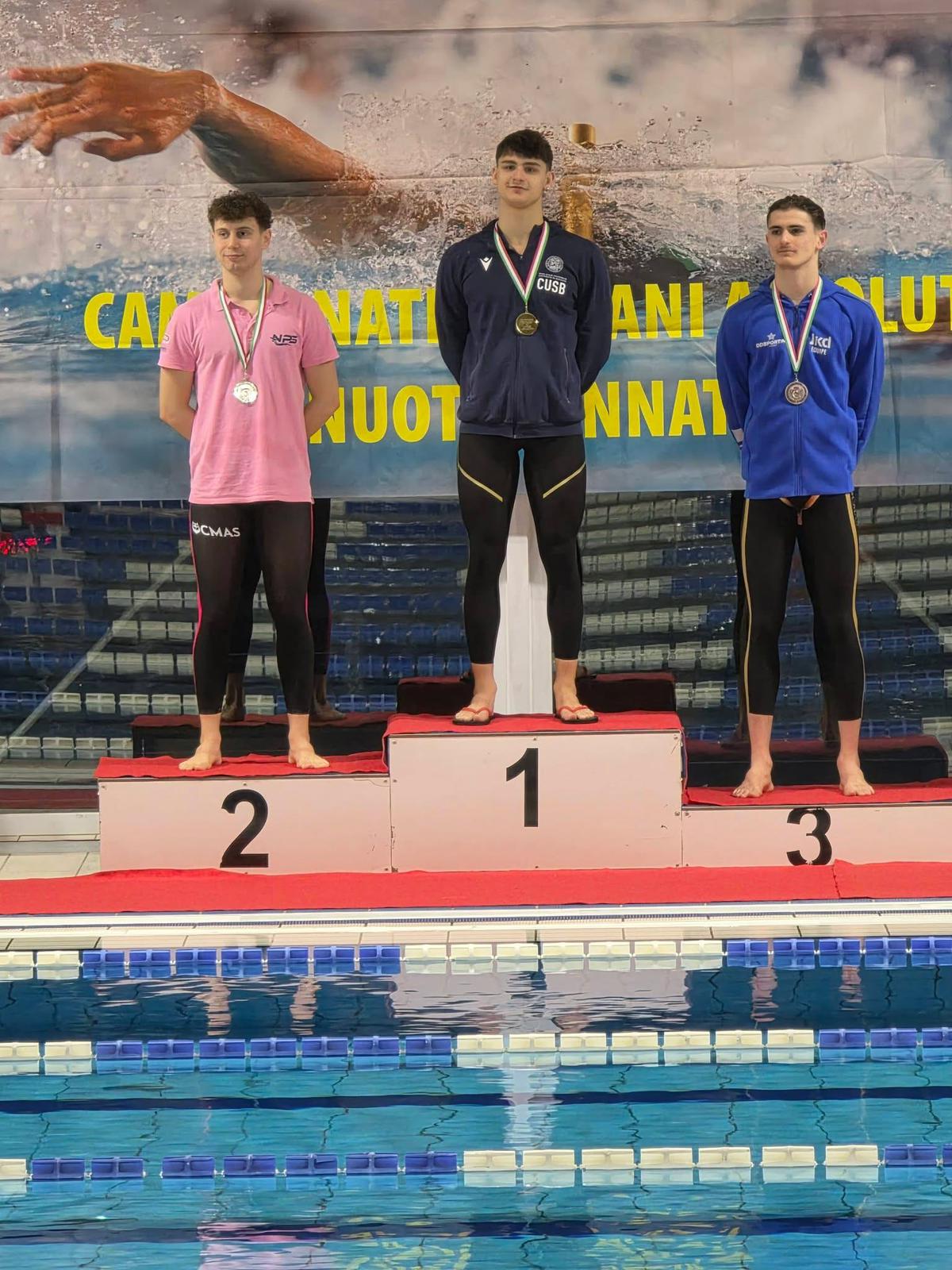 Il trascinatore del gruppo è Christian Degli Esposti, autore di un campionato da leader: oltre al titolo italiano nei 200 metri monopinna Assoluti, conquista l’argento nei 100 monopinna e firma l’oro nei 400 monopinna CMAS assoluta, con Gianluca Ghini a completare la festa CUS grazie al bronzo nella stessa prova.